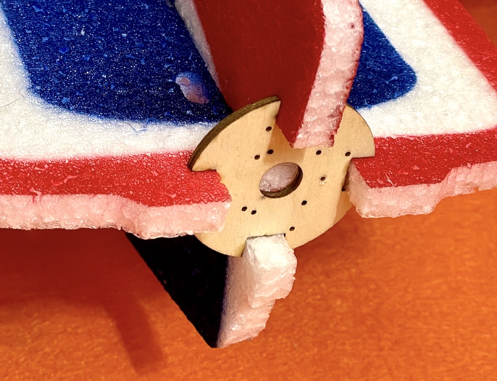 Find the two small plywood pivots and glue them to the end of the wings so the hole lines up with the