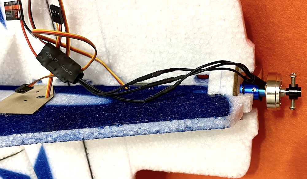 Install the motor and ESC into the mount. Put the ESC/Motor wires on the same side of the fuselage as