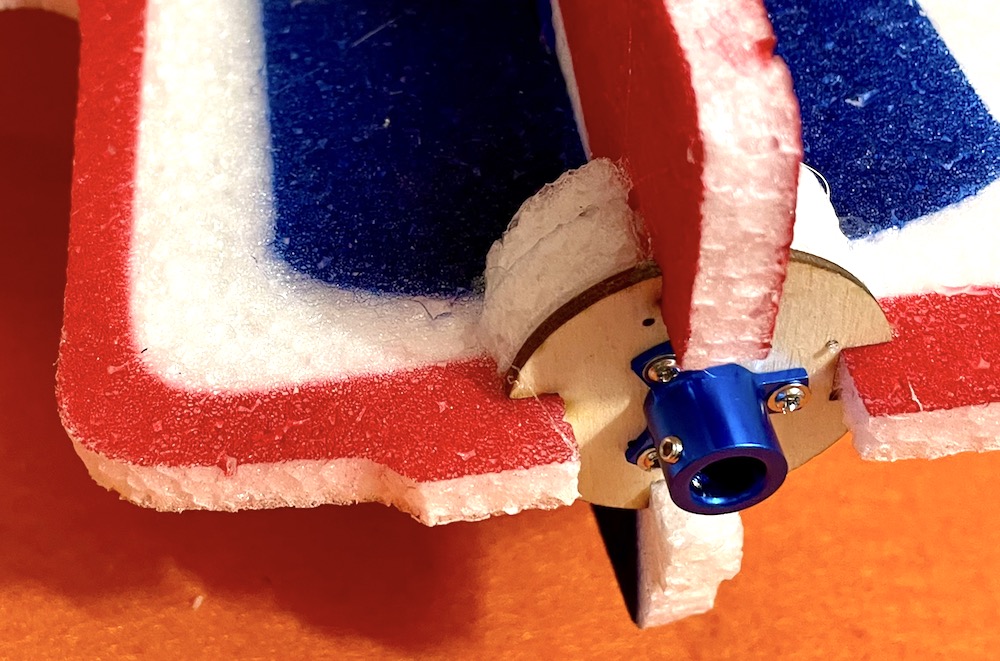 servo pocket at the nose with the spline shaft towards the tail of the plane and glue in place (I normally