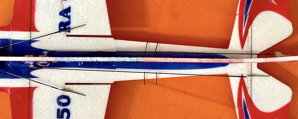 Measure and cut the pushrods to be the distance from the servo splined post screw hole to the hinge line at the horn,